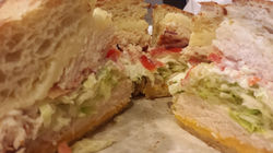 Lettuce, tomato, pickle, and turkey or tuna salad, topped with cheddarand mozzarella cheeses.